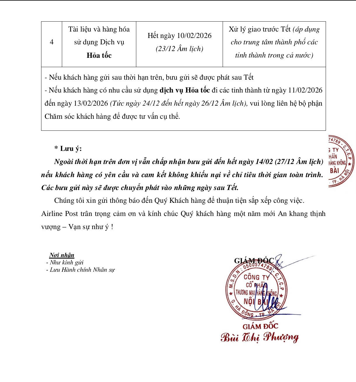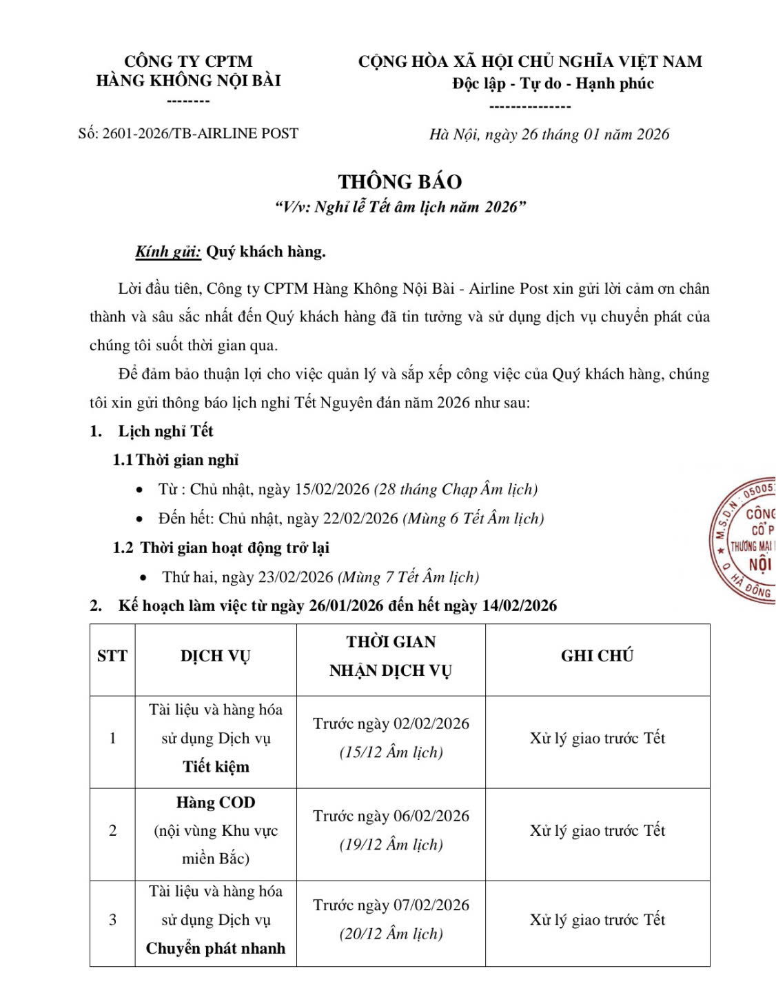 Nhân dịp Tết Nguyên Đán 2026, AIRLINEPOST xin thông báo lịch nghỉ Tết như sau: